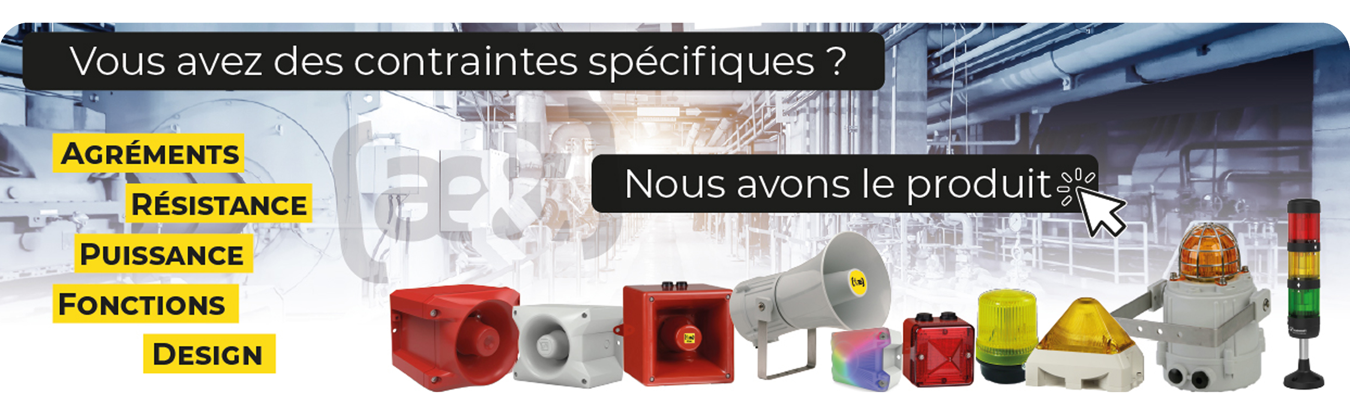 Découvrez nos sirènes d’alerte, sirènes incendie, avertisseurs optiques, téléphones, presse-étoupes, luminaires, amortisseurs de chocs...pour industrie, ERP et zones ATEX