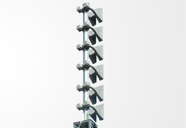 From 12 to 24 high power loudspeakers can be installed on a pole depending on the size of the area to be covered.
